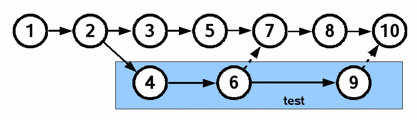 Check-in 4 has a branch tag which changes the name of the branch to "test". The branch tag on check-in 4 propagates to check-ins 6 and 9. But because tag propagation does not follow merge links, the branch=test tag does not propagate to check-ins 7, 8, or 10. Note also that the branch tag on check-in 4 blocks the propagation of branch=trunk so that it cannot reach check-ins 6 or 9. This causes check-ins 4, 6, and 9 to be in the "test" branch and all others to be in the "trunk" branch.