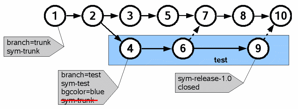 Check-in 4 also has a sym-test tag, which gives the symbolic name "test" to check-ins 4, 6, and 9. Because tags do not propagate across merges, check-ins 7, 8, and 10 do not inherit the sym-test tag and are hence not known by the name "test". To prevent the sym-trunk tag from propagating from check-in 1 into check-ins 4, 6, and 9, there is a cancellation tag for sym-trunk on check-in 4. The net effect of all of this is that check-ins on the trunk go by the symbolic name of "trunk" and check-ins that are on the test branch go by the symbolic name "test".